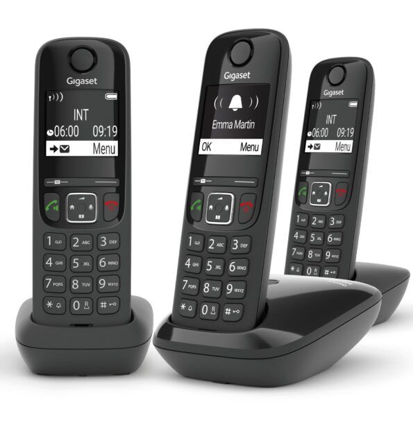 Il Gigaset AS690 Trio rappresenta una soluzione ideale per chi cerca un sistema telefonico cordless affidabile e versatile. Questo set include tre portatili, permettendo di gestire chiamate interne ed esterne in parallelo con estrema facilità. La caratteristica distintiva di questo modello è il suo display illuminato ad alto contrasto, che offre una leggibilità ottimale anche in condizioni di scarsa luminosità. La modalità numeri Jumbo facilita ulteriormente la visualizzazione, rendendolo perfetto per utenti di tutte le età.