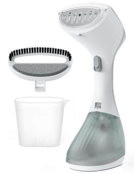 Il dispositivo include diversi accessori utili, come la punta spazzola per tessuti, ideale per rimuovere pelucchi e peli di animali dai vestiti, la pinza per pantaloni, che ti aiuterà a stirare in modo impeccabile anche i capi più difficili, e il contenitore graduato per un comodo riempimento del serbatoio.