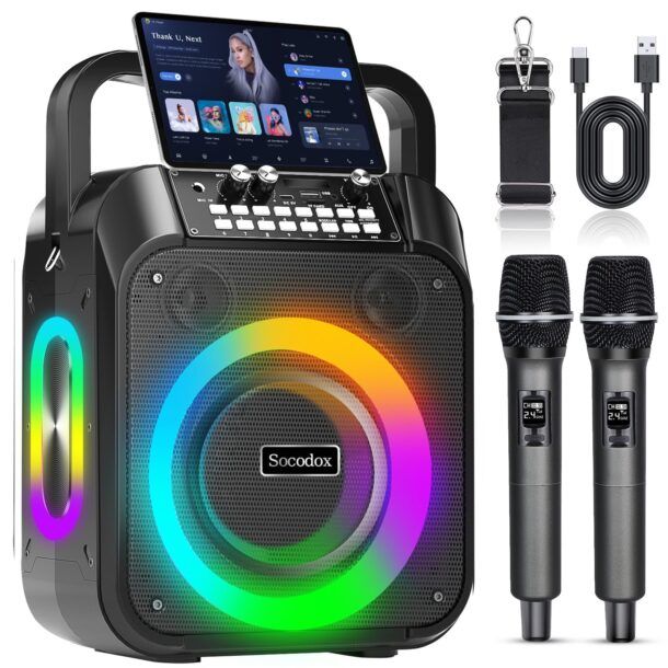 Il karaoke portatile socodox V2 è una macchina karaoke tutto‑in‑uno pensata per farti organizzare vere sessioni di canto praticamente ovunque. Il cuore del sistema è un altoparlante da 60W con un mid‑bass da 6,5 pollici e due tweeter dedicati alle alte frequenze: una configurazione che, unita al doppio diaframma per i bassi, ti offre bassi fino all’80% più profondi rispetto ai comuni speaker portatili. Il risultato è un suono pieno, con voci ben in evidenza e una base musicale che rimane corposa anche a volumi elevati, senza distorsioni fastidiose.