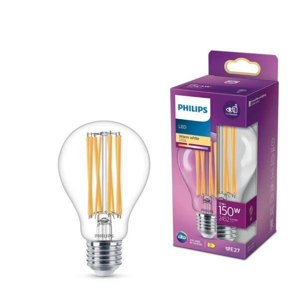 La POS LED GOCCIA FILAMENTO 150W E2 Eyecomfort di Philips rappresenta un'eccellente soluzione per chi cerca una lampadina a LED che coniughi efficienza energetica e comfort visivo. Questa lampadina, caratterizzata da un design classico a goccia, è realizzata in vetro e offre una luce bianca calda con una temperatura colore di 2700 Kelvin, ideale per creare un'atmosfera accogliente e rilassante nei tuoi spazi.