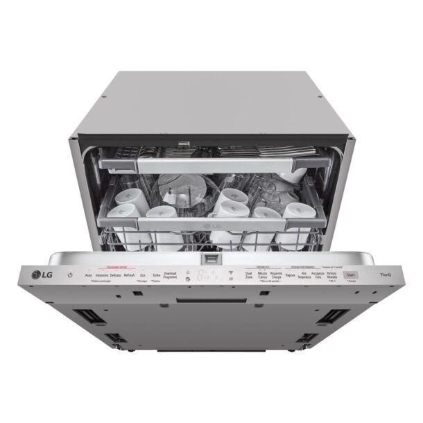 Un'altra caratteristica degna di nota è la connettività Wi-Fi tramite ThinQ, che ti consente di controllare la lavastoviglie direttamente dal tuo smartphone. Puoi scaricare nuovi programmi di lavaggio, configurare opzioni personalizzate e ricevere notifiche sulla manutenzione ordinaria, rendendo la gestione dell'elettrodomestico semplice e intuitiva.