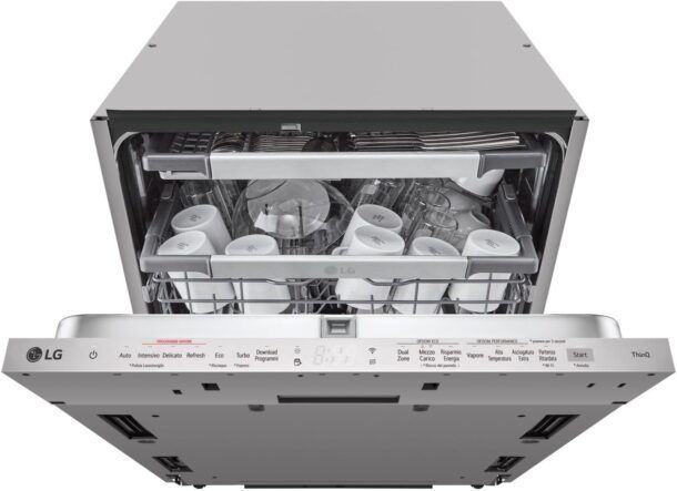 Inoltre, grazie alla connessione Wi-Fi con ThinQ, puoi controllare la lavastoviglie dal tuo smartphone, scaricare nuovi programmi, configurare le opzioni di pulizia e ricevere notifiche relative alla manutenzione ordinaria. Un dettaglio molto utile è l'Info Light, una luce di servizio proiettata sul pavimento che indica se la lavastoviglie è in funzione o se ha terminato il ciclo.