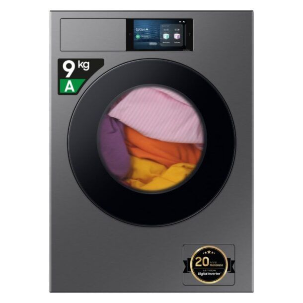La tecnologia Ecobubble è un altro punto forte: la capacità di lavare a freddo con l’efficacia di un ciclo a caldo consente di ottenere una pulizia profonda anche a basse temperature, contribuendo ulteriormente alla riduzione dei consumi energetici. Le bolle preattivano il detergente, migliorandone la penetrazione nei tessuti, particolarmente utile su cotoni spessi o capi tecnici. Abbinata a una capacità di 9 kg, questa soluzione rende la Bespoke AI adatta a famiglie o a chi lava frequentemente grossi carichi, come lenzuola e asciugamani, mantenendo però una struttura standard da 60 x 60 x 85 cm facile da collocare.