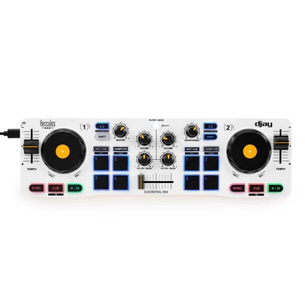 Il Hercules DJControl Mix è un controller DJ wireless Bluetooth progettato per smartphone, con una compatibilità estesa anche a tablet e iPad Android. Questo dispositivo bianco dal design elegante e minimalista pesa solo 920 grammi ed ha dimensioni di 41,5 x 10 x 4,5 cm, rendendolo facilmente trasportabile e maneggevole.