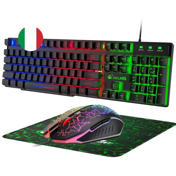 Questo set Rii RK900 è un kit tastiera + mouse pensato per chi vuole un’esperienza di gioco completa con layout italiano e un’impostazione immediatamente familiare se scrivi in italiano ogni giorno. La tastiera adotta uno schema QWERTY IT, con tutti i caratteri speciali correttamente posizionati, così non devi riabituarti né usare combinazioni strane per ottenere simboli come @, #, ;, : e simili.
