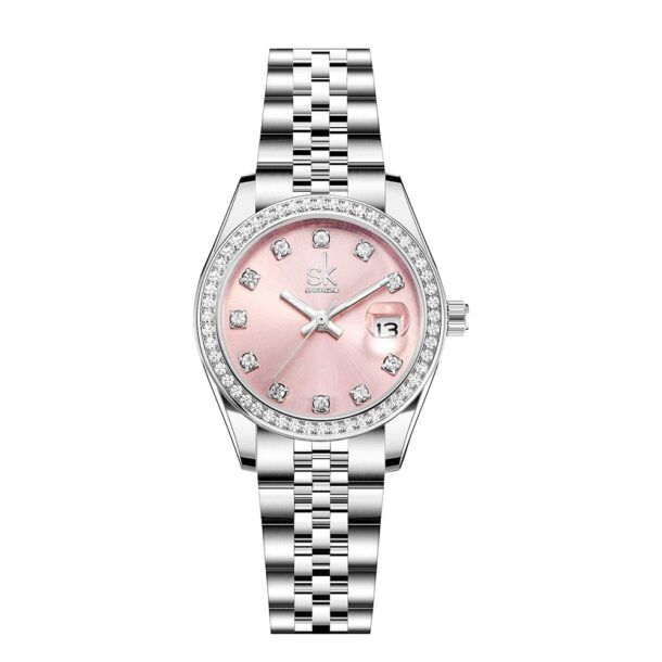 Questo SHENGKE argento-rosa si presenta come un orologio pensato per chi vuole un accessorio elegante ma allo stesso tempo pratico nella quotidianità. Il primo elemento che colpisce è il quadrante dal colore particolare rosa-oro-verde, una tonalità cangiante che crea riflessi diversi a seconda dell’illuminazione. L’effetto visivo è ulteriormente enfatizzato dall’anello di piccoli cristalli trasparenti sulla lunetta e dagli indici anch’essi impreziositi da cristalli, una scelta che dona un aspetto decisamente raffinato, senza risultare eccessivo se abbinato a outfit formali o da ufficio.