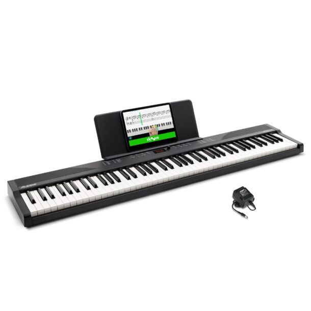 Un ulteriore punto di forza è la flessibilità nell’alimentazione: oltre all’alimentatore incluso, puoi utilizzare 6 batterie AA, caratteristica che rende lo strumento adatto anche a contesti in cui non hai prese a disposizione. Il leggio robusto per spartiti o tablet integrato nel corredo contribuisce a una postazione ordinata e funzionale, particolarmente utile quando lavori con app didattiche o PDF.