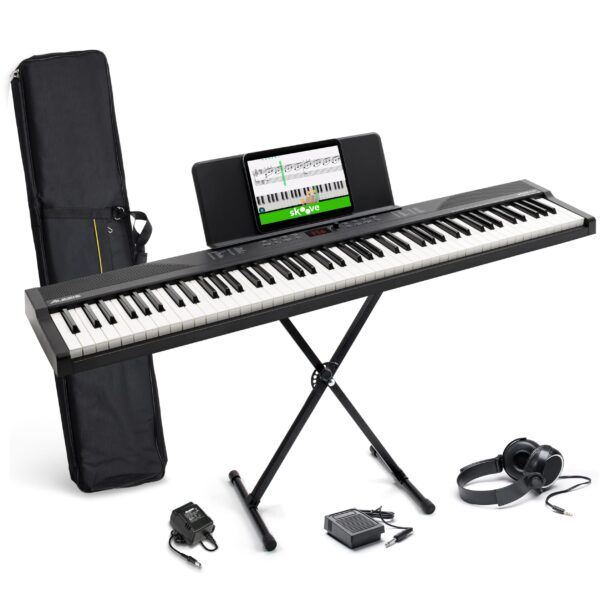 Il design portatile e compatto, insieme agli altoparlanti integrati, permette di suonare ovunque tu voglia, senza compromessi sulla qualità del suono. L'ingresso per pedale di sustain, l'uscita cuffie e l'ingresso Aux ampliano ulteriormente le opzioni di utilizzo, garantendo flessibilità in ogni situazione. Il pacchetto completo di accessori, che include un supporto regolabile, un leggio, un pedale di sustain, cuffie e una custodia per il trasporto, assicura che tu abbia tutto ciò di cui hai bisogno per iniziare subito a suonare.