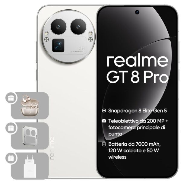 Il GT 8 Pro di realme si presenta come un dispositivo progettato per chi pretende prestazioni di alto livello, con una configurazione che punta tutto su potenza di calcolo, qualità d’immagine e autonomia. Al centro c’è il chip Snapdragon 8 Elite Gen 5, realizzato con processo produttivo a 3 nm di seconda generazione TSMC, che garantisce una gestione estremamente efficiente delle risorse. In pratica, se utilizzi applicazioni pesanti, multitasking spinto o giochi graficamente complessi, ti ritrovi con una risposta sempre fluida e reattiva, senza rallentamenti percepibili.