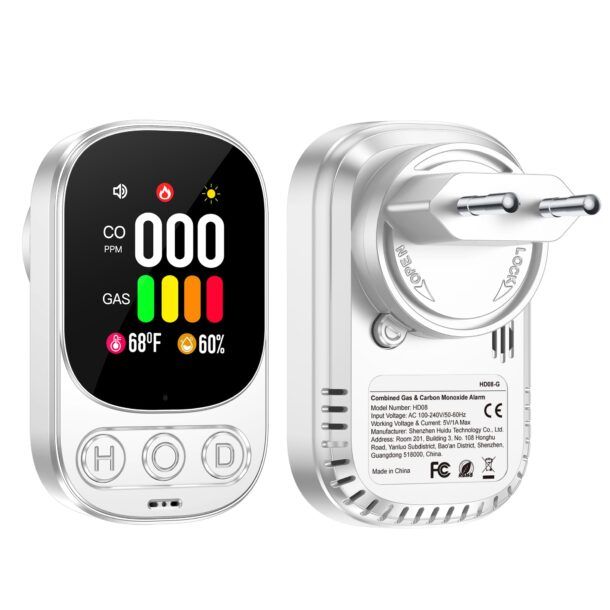 Il Gedsffati Rilevatore di Gas e Monossido di Carbonio, modello HD08-G, rappresenta un'innovazione nel campo della sicurezza domestica. Progettato per essere collegato direttamente alla presa di corrente, questo dispositivo si distingue per la sua capacità di monitorare costantemente i livelli di monossido di carbonio (CO) e gas combustibili come metano, propano e butano. Grazie al suo design compatto e leggero, con dimensioni di 8,5 x 5,1 x 3,3 cm e un peso di soli 60 grammi, si integra facilmente in qualsiasi ambiente domestico senza risultare invasivo.