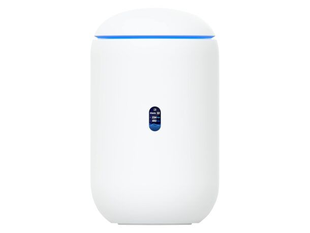 Dream 7 di Ubiquiti è un dispositivo di rete compatto e verticale, di colore bianco, pensato per chi vuole portare a casa una piattaforma di connettività di livello professionale. Con dimensioni contenute (10 x 20 x 10 cm) e un peso di circa 1 kg, si integra facilmente su una scrivania o in un mobile tecnico senza risultare invasivo, pur nascondendo componenti di fascia alta.