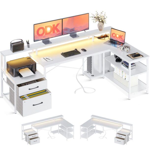 Uno dei punti di forza della scrivania è la sua configurazione reversibile, che ti permette di adattarla facilmente alle esigenze del tuo spazio, sia che tu preferisca un angolo sinistro o destro. Questa flessibilità è particolarmente utile se desideri ottimizzare l'uso dello spazio nel tuo ufficio o nella tua stanza. Inoltre, i due cassetti per documenti e l'armadio per stampante offrono soluzioni pratiche per mantenere tutto in ordine, mentre il ripiano inferiore a due livelli aggiunge ulteriore capacità di archiviazione.