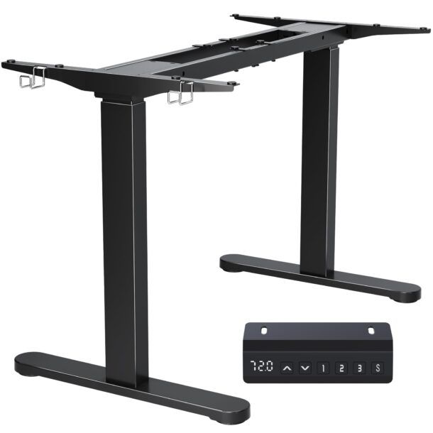 Questa scrivania elettrica BONTEC a doppio motore è un telaio regolabile in altezza pensato per chi vuole trasformare la propria postazione in un ambiente ergonomico e altamente stabile, sia per lavoro che per gaming. La struttura è interamente in metallo con finitura nera, di forma rettangolare e con gambe a sostegno, progettate per ospitare piani da circa 120 a 180 cm di larghezza e fino a 58,4 cm di profondità, rimanendo compatta in termini di ingombro.
