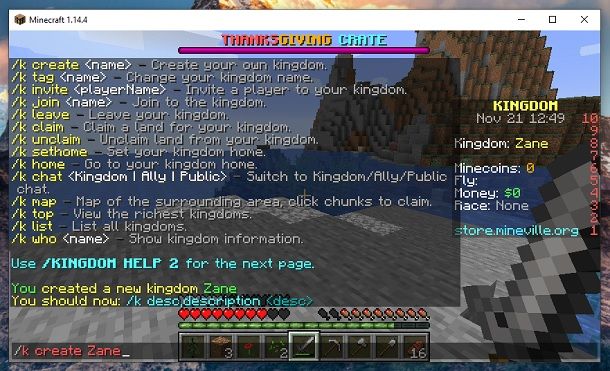 Successivamente, digita il comando /k claim, per comprare il terreno. Dopodiché, non ti resta che utilizzare il comando /k sethome per rendere questo posto la tua casa. Perfetto ora puoi creare il tuo regno dei sogni. Dovrai quindi andare in giro per la mappa, proprio come nella modalità Survival “classica”, a raccogliere i materiali necessari per creare le strutture del tuo regno e salire di livello. Per tornare a casa, puoi usare il comando /k home.