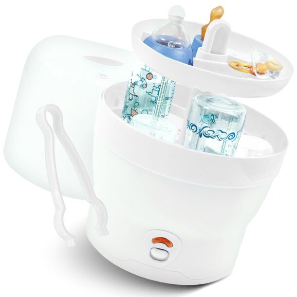 - Sterilizzatore a vapore elettrico – è una delle soluzioni più diffuse. Riscalda l'acqua fino a generare vapore ad alta temperatura, eliminando germi e batteri in circa 10 minuti. Consente di sterilizzare più oggetti contemporaneamente, ma occupa spazio sul piano della cucina e richiede una manutenzione regolare, inclusa la decalcificazione.