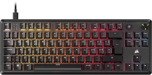 La CORSAIR K70 CORE TKL RGB è una tastiera meccanica progettata per i giocatori più esigenti, che combina un design compatto con funzionalità avanzate. Il suo layout senza tastierino numerico libera spazio prezioso sulla tua scrivania, permettendoti di muovere il mouse con maggiore libertà e precisione durante le sessioni di gioco intense. Questa caratteristica la rende ideale per chi cerca una configurazione minimalista ma altamente efficiente.