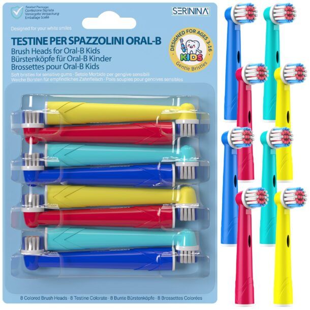 Le 8 Testine per Oral B Bambini di Serinina rappresentano una soluzione eccellente per garantire un'igiene orale ottimale ai più piccoli. Compatibili con una vasta gamma di spazzolini elettrici Oral-B, queste testine si adattano perfettamente a modelli come Vitality, Triumph, Genius, Professional, TriZone, Advance, Pro, 3D Excel, Plak Control, Sensitive, White, Clean e Interclean. Tuttavia, è importante notare che non sono compatibili con i modelli Pulsonic e iO.