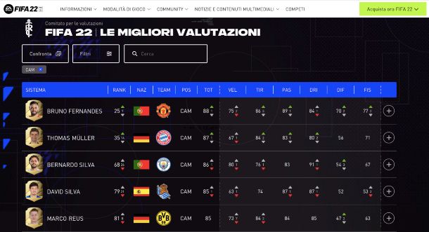 Se invece sei alla ricerca dei migliori trequartisti FIFA 22, anche qui puoi verificare quali sono i giocatori più forti accedendo al database online di questa edizione del gioco e poi seguendo il medesimo percorso, che ti ho spiegato nel paragrafo precedente e che ti ripeto brevemente: collegati al database di FIFA 2022 premi su Filtri, poi fai clic su Ruolo e seleziona COC (o CAM), quindi premi su Fine e fai clic su Applica.