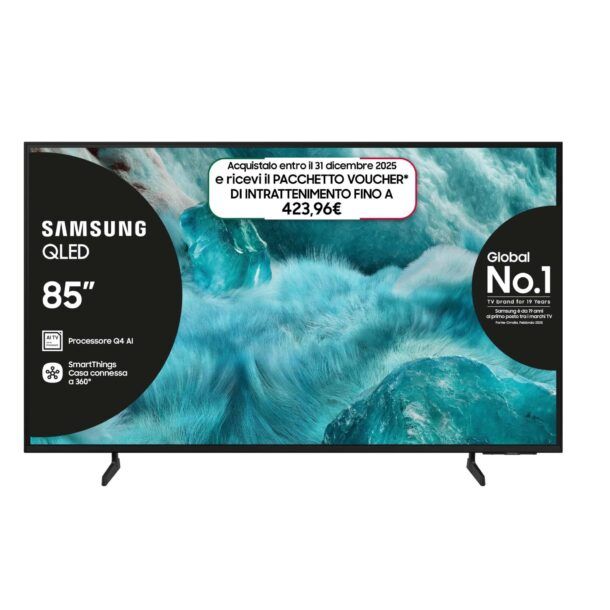 La Samsung Smart TV da 85 pollici, modello QE85Q7F4AUXZT, rappresenta un capolavoro di tecnologia e design. Con il suo schermo QLED 4K e il processore Q4 AI, questa TV offre una qualità d'immagine straordinaria che cattura ogni dettaglio con precisione sorprendente. La tecnologia Quantum Dot garantisce un 100% di volume colore, trasformando la luce in colori vividi e realistici che mantengono la loro intensità anche nelle scene più complesse.