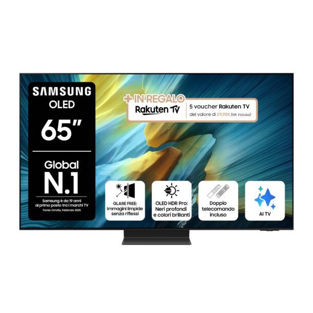 Questo Samsung S95F da 65 pollici è un pannello OLED 4K pensato per chi pretende un livello di qualità visiva e di integrazione smart superiore alla media. Il cuore del sistema è il processore NQ4 AI Gen4, progettato per sfruttare algoritmi di 4K AI Upscaling che analizzano ogni fotogramma in tempo reale. Se guardi contenuti non nativi in 4K, l’algoritmo interviene su contorni, texture e rumore video per avvicinare la resa alla definizione ultra HD, mantenendo un’immagine pulita e con dettagli fini ben leggibili.