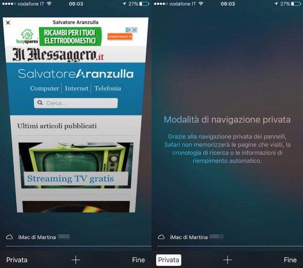 Sui dispositivi Apple, come iPhone e iPad, puoi utilizzare la navigazione in incognito comodamente tramite Safari, il browser che trovi già installato su tutti i dispositivi Apple. Per avviare una finestra in questa modalità di navigazione, apri Safari e poi fai tap sull’icona in basso a destra (o in alto a destra su iPad) con il simbolo di due quadrati. Ora seleziona la voce al centro con la dicitura [numero] pannelli oppure Pagina di apertura, apponi poi il segno di spunta in corrispondenza della voce Privata e pigia su Fine in basso a destra (o in alto a destra su iPad).