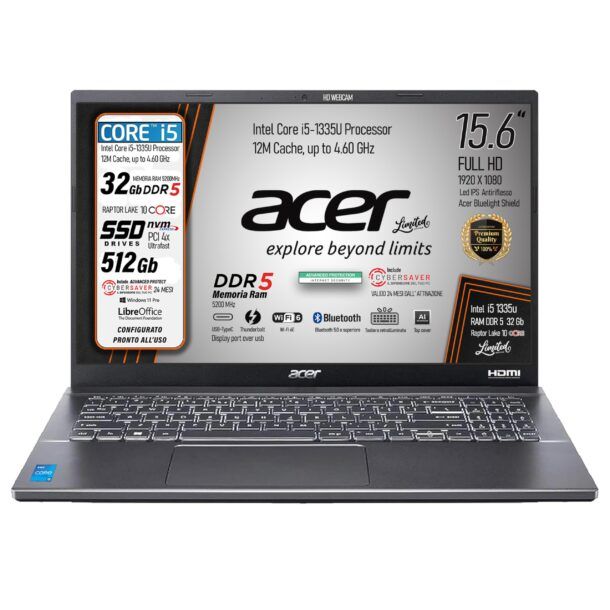 L'Acer Aspire 5, nella sua versione con processore Intel Core i7-13620H, rappresenta un equilibrio tra potenza e versatilità, ideale per chi cerca prestazioni elevate in un formato portatile. Questo notebook si distingue immediatamente per il suo design elegante in Grigio Acciaio, che conferisce un aspetto professionale e moderno.