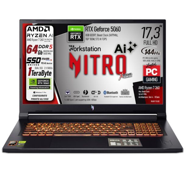 Nonostante le sue dimensioni generose, con un peso di circa 2,7 kg, il Nitro V17 Ai rimane relativamente portatile per un laptop di questa categoria. La batteria da 76 Wh offre una buona autonomia, sebbene sia consigliabile avere sempre a disposizione una fonte di alimentazione per sessioni prolungate.