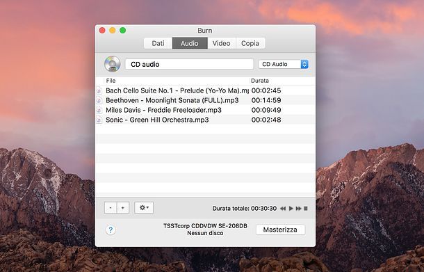 Ora che visualizzi la finestra di Burn sulla scrivania del tuo Mac, seleziona la scheda Audio, imposta la voce CD audio dal menu a tendina situato in alto a destra e copia tutte le canzoni da masterizzare trascinandole nella sezione apposita.