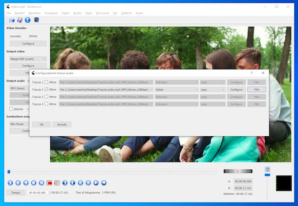 Nel caso in cui il filmato in questione presenti già una traccia audio, rimuovila (dato che dovrai poi procedere al doppiaggio). Per effettuare quest’operazione, fai clic destro sul video in questione, seleziona l’opzione Scollega audio dal menu che compare a schermo, fai clic destro sul tracciato del file audio scollegato e premi sull’opzione Rimuovi. Dopodiché segui, a partire da in alto a sinistra, il percorso File > Apri altro, in modo da poter premere sull’opzione Dispositivo audio/video nella finestra che compare a schermo. Sarà qui, dunque, che potrai selezionare il microfono associato al tuo computer che intendi utilizzare come Ingresso audio. Ricordati di premere sul pulsante OK per applicare le modifiche.