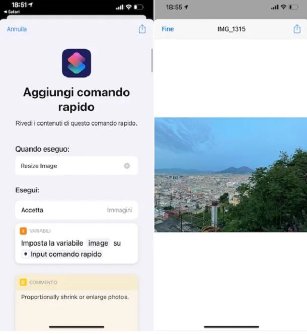 Con lo script installato nell’app Comandi, puoi proseguire con il ridimensionamento, quindi apri l’app Comandi, fai tap sulla voce I miei comandi rapidi posta in basso, quindi premi sulla scelta Resize Image. Puoi ora selezionare la foto da ridimensionare (autorizza l’accesso alle foto, se necessario) e indicare la risoluzione usando le opzioni disponibili. Per scegliere una dimensione personalizzata fai tap sulla scelta Custom (%), inserisci le percentuali e fai tap sul tasto Fine.