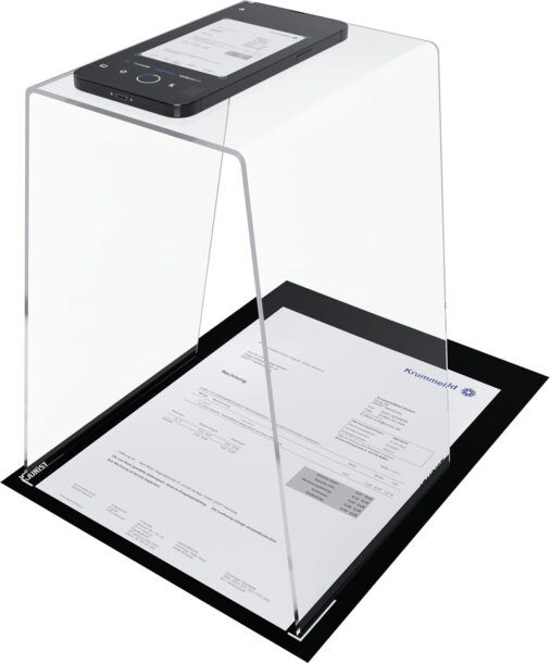 Uno degli aspetti più interessanti del ScanStand è la sua capacità di gestire documenti fino al formato A4 senza difficoltà. Il tappetino nero incluso è realizzato in plastica morbida e svolge un ruolo cruciale nel processo di scansione: assicura un contrasto perfetto, facilitando il riconoscimento dei margini e il ritaglio preciso delle pagine. Questo elemento è particolarmente utile quando si lavora con documenti di dimensioni ridotte, come scontrini o biglietti da visita, poiché i contrassegni sul tappetino aiutano a centrare correttamente il documento.