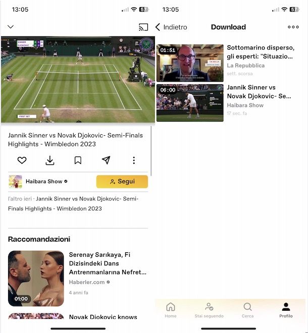 Tutti i video scaricati sono disponibili nella sezione Download del tuo account, alla quale puoi accedere selezionando l’opzione Profilo collocata nel menu in basso, premendo sul pulsante ☰ e facendo tap sulla voce Download.