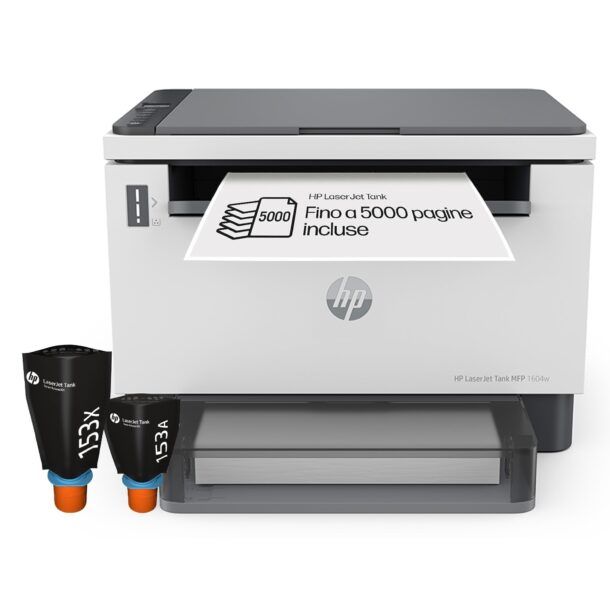 In termini di design, la HP Laser Tank 1604w è elegante e compatta. Il suo colore bianco la rende adatta a qualsiasi ambiente di lavoro o domestico. Nonostante le sue dimensioni ridotte, questa stampante è in grado di gestire un vassoio di alimentazione da 150 fogli, permettendoti di stampare grandi quantità di documenti senza dover continuamente ricaricare il vassoio.