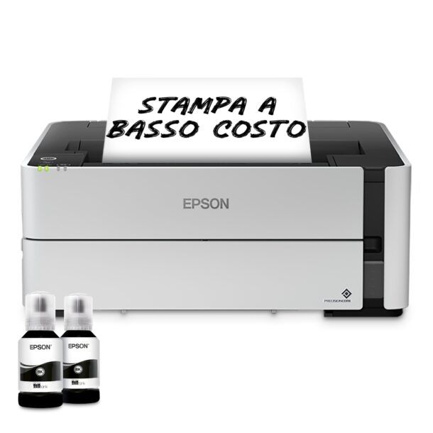 L'Epson EcoTank M1100 è una stampante a getto d'inchiostro di alta qualità, ideale per l'uso in ufficio. Questo modello, con la sua elegante finitura bianca e nera, offre un'eccellente resa di stampa, garantendo fino a 6.000 pagine con ogni bottiglia d'inchiostro.