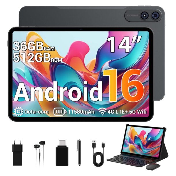 Questo SADSYMB M328 da 14 pollici è pensato per chi vuole sostituire il portatile con un dispositivo più versatile, senza rinunciare a potenza, grande schermo e completa connettività. Il cuore del sistema è il processore octa‑core UNISOC T7280 a 2,0 GHz, abbinato a 36 GB di RAM (12 GB fisici con espansione RAM virtuale) e 512 GB di archiviazione interna, espandibile tramite scheda fino a 2 TB: una configurazione che, nella pratica, ti permette di gestire numerose app aperte, documenti pesanti e librerie multimediali molto ampie senza rallentamenti evidenti.