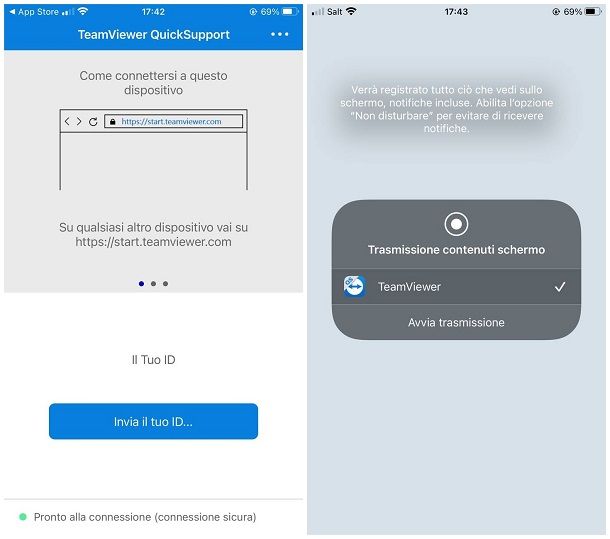 Per ricevere assistenza remota e far sì che qualcuno possa vedere ciò che succede sullo schermo dello smartphone oppure del tablet (e, nel caso di Android, controllarlo), devi invece servirti dell’app TeamViewer QuickSupport, anch’essa disponibile sugli store per Android, iPhone e iPad. Dopo averla scaricata dallo store di riferimento del tuo dispositivo, avviala e configurala in modo opportuno, attenendoti alla procedura più adatta al sistema operativo da te in uso.